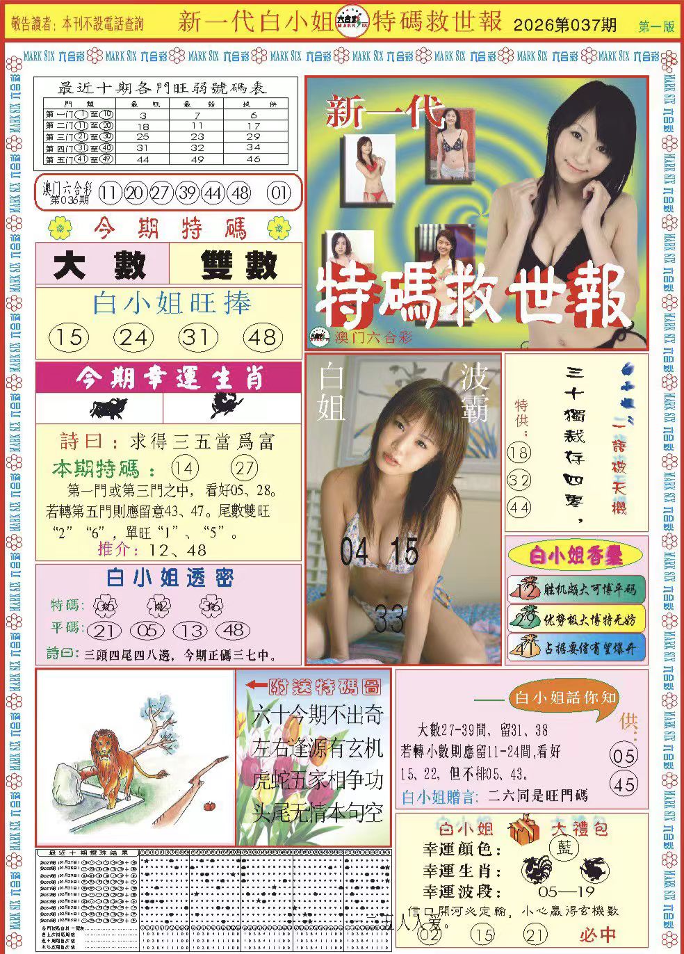033期:复式连肖【牛鸡马虎猴】开4个 |